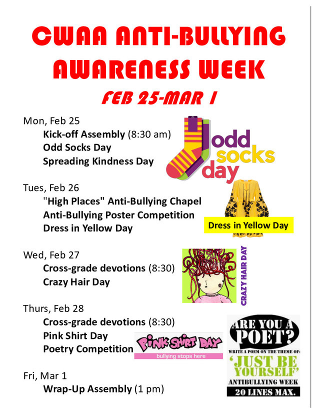 | CHOOSE KINDNESS: KICKING OFF OUR ANTI-BULLYING AWARENESS WEEK Imagine what CWAA would be like if we only used kind words, acted with kindness all the time, asked for forgiveness when we hurt others, included others, acted humbly and we all lived by the Golden Rule! This week at CWAA we will be focusing on the theme: “Choose Kindness”! In our past Anti-Bullying Awareness Weeks, we have focused on bullying behaviours for the purpose of creating awareness and knowledge. This year, however, we would like to focus on building a positive culture - based on kind words and actions. Why did we choose a kindness theme? Kindness can help lift others up when they‘re down. No-one ever knows the struggles people are going through inside. Kindness will never come back to hurt you! Kindness is good for your health (releases oxytocin which