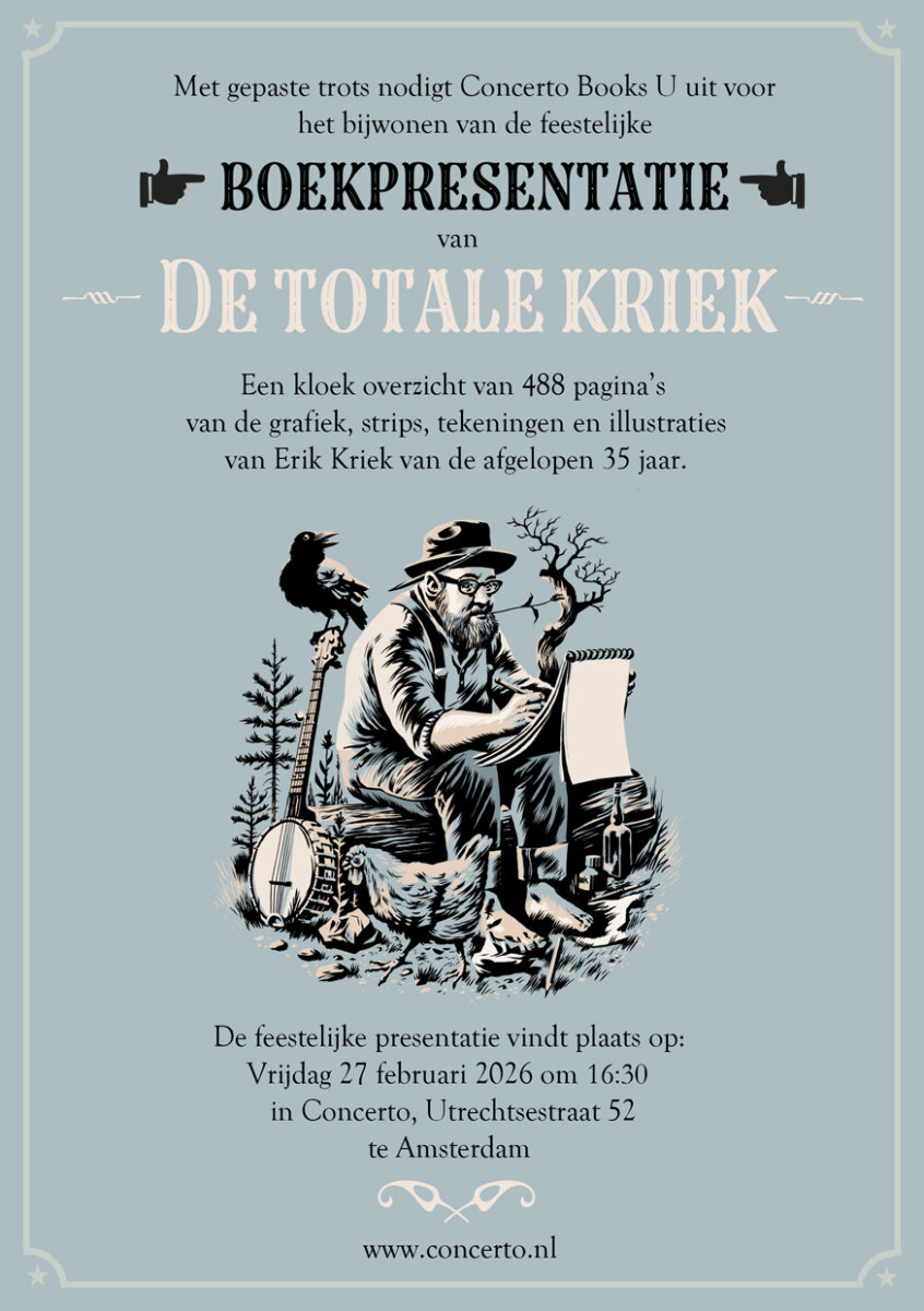 Vrijdag vanaf 16:30 komt Erik Kriek komt zijn nieuwe boek presenteren bij Concerto, inclusief een optreden van Blue Grass Boogiemen.